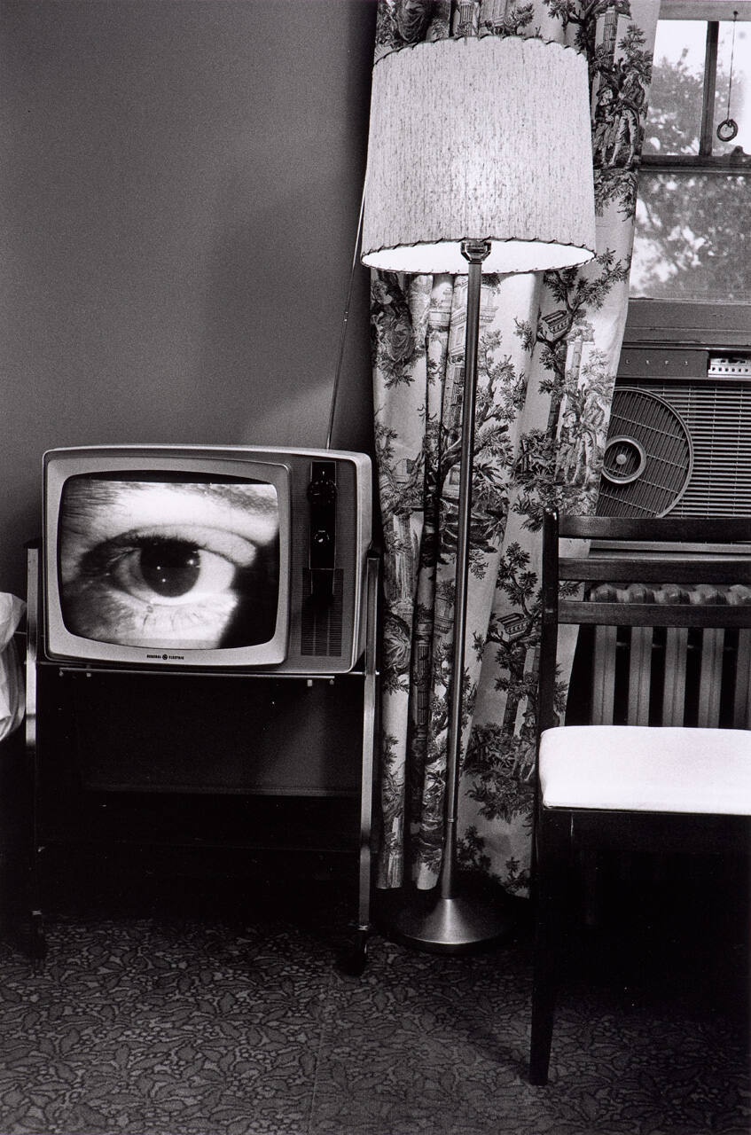DescriptionImage of room with television with a human eye on the screen. Television is on the far left, floor lamp in center, window with curtins and a/c unit on the right half, and a chair on the far right.Exhibition History