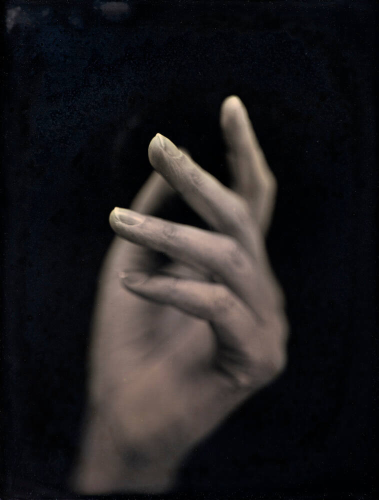 Jerry Spagnoli crafts contemporary daguerreotypes that display both his technical mastery and an astute understanding of how this demanding process informs the conceptual aspects of picture-making. In this plate, a woman’s hand, twisting gracefully in space, is rendered with a shallow depth of field. Two fingers appear in sharp focus, and extend towards the viewer, while the remaining portion of the hand appears blurred against a dark backdrop. Seductive and ghostly, the visual allure of this image derives from Spagnoli’s deep understanding and fascination with the daguerreotype process.