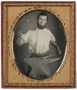 DescriptionImage of a bearded man standing in front of his anvil with a raised hammer in one hand and a piece of metal in the other. This sixth plate cased daguerreotype is housed in an oval brass mat inside of a decorative brown case with an embossed red velvet liner.