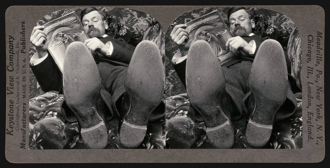 DescriptionImage of a reclining man reading Stereoscopic Photograph magazine (focus on enlarged feet in foreground).Gallery LabelThese closely cropped images of a man reading a magazine appear the same at first glance, but upon closer inspection, the perspective of the two photographs differs slightly. When observed through a stereoscope—a handheld or large viewing device like the one featured here—the two photographs converge into one three-dimensional image. This revolutionary process challenged the ways people understood visual perception. In this example, the photographer intentionally situated the camera lens near the man’s feet to enhance the perspective and create a strong three-dimensional effect.