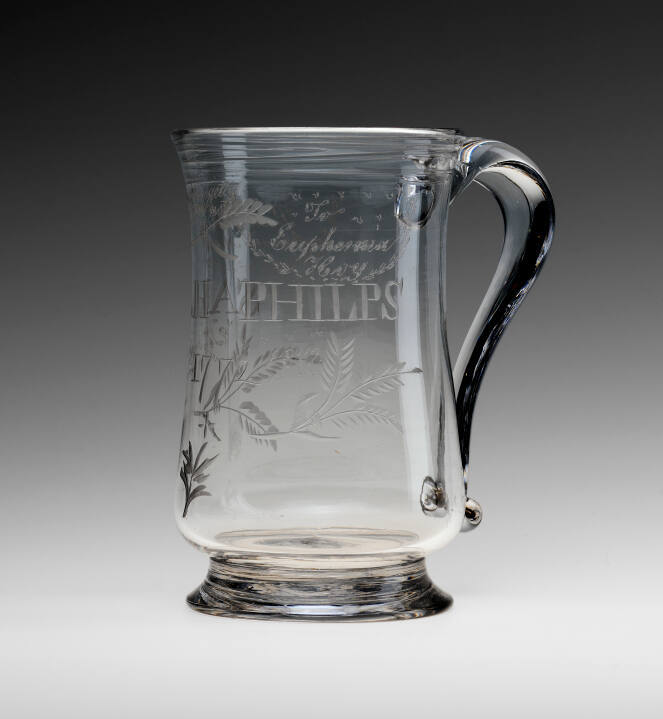 DescriptionBell-shaped, flaring out at tooled rim, loop-strap applied handle; decorated with wheel engraving opposite handle: "Sarah Philps/1772" with foliate sprays above and below; later diamond-point engraving "Presented by/Annie Morris To Euphenia Hoy 24th Jan'y/1872" with "for get me not" engraved at rim over crossed palm fronds; circular applied foor
