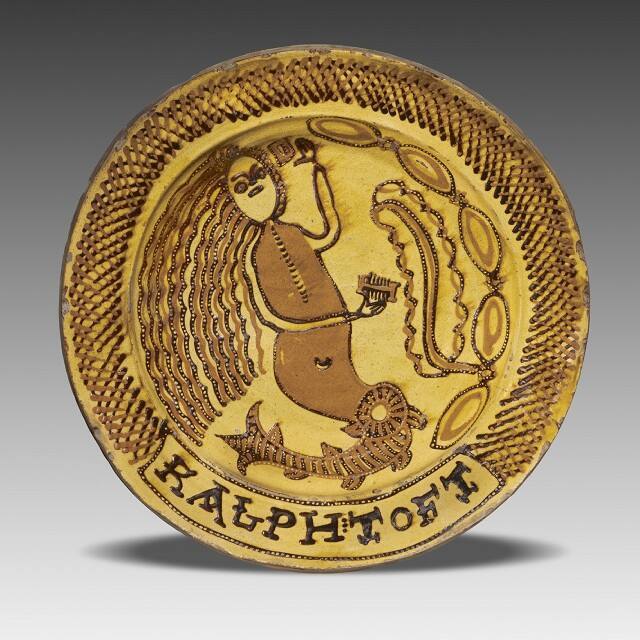 Gallery LabelThe bold names and dates incorporated into the pottery's decoration promote a position of status for both the patron who could afford such objects and the potter who wished to market his wares. Some of the most elaborately executed slipware pieces are associated with members of the Toft family, such as this charger by Ralph Toft. Here, a mermaid with long, flowing hair and coiled fishtail holds her attributes, a comb and mirror. Mermaids, a popular motif during this period, are often related to the sirens of Greek mythology whose enchanting songs lured sailors to shipwreck.