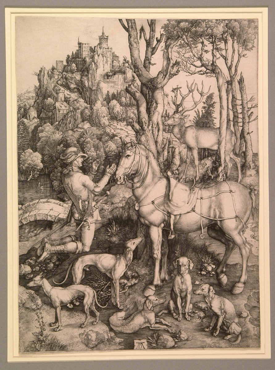 Albrecht Dürer’s Saint Eustace demonstrates his ability to depict the natural world with an almost scientific attention to detail. This ambitious engraving, the largest he ever produced, portrays the conversion of a second century Roman general to Christianity. While out hunting in the woods, Saint Eustace had a vision of the crucified Christ between the antlers of a deer. Here, five hunting dogs rest on a rocky hillside where tufts of grass compete for space with gnarled roots and branches. Dürer’s contemporaries greatly admired the dogs and copied their various poses.