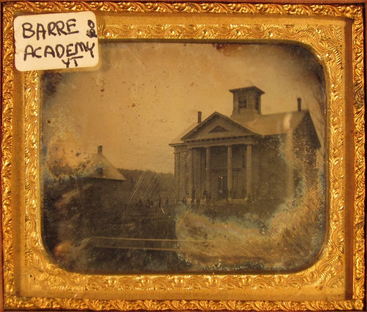 Description1/6 plate daguerreotype of an outdoor view of Barre Academy in Vermont. Housed in a leather half case (missing top).