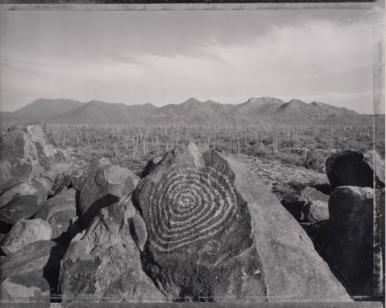 Spiral carving facing east, Signal Hill, Saguaro, N.M., 5/7/83