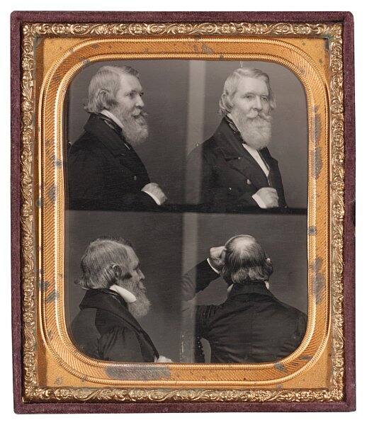 James Duncan Graham Sr. (1799–1865) spent his life surveying, documenting, and demarcating boundaries. Working for the American government, he mapped the US-Canada border, US-Mexico border, and the Mason-Dixon line (the boundary between American states that allowed slavery and those that did not). Sitting in photographer Alexander Hesler’s Chicago studio, Graham seems to have requested his own personal survey, turning for Hesler’s camera to document his full appearance.