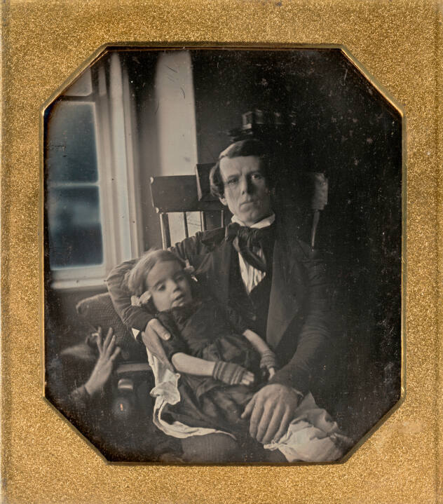 DescriptionImage of man wearing a suit and tie holding a young girl in his lap. The girl is wearing a dark colored dress, fingerless gloves, and bows in her hair. A partially hidden figure holds a pillow behind the girl's head. This quarter plate daguerreotype is housed in a brass mat inside of a case.