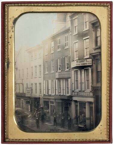 DescriptionHalf plate daguerreotype of Chestnut Street attributed to William Mason, ca. 1853 in full elather case; top detached. Depicts McAllister's optical shop on Chestnut St.Exhibition HistoryDeveloping Greatness: the Origins of American Photography, 1839-1885. The Nelson-Atkins Museum of Art, Kansas City, MO, June 9 – December 30, 2007, no. 32.