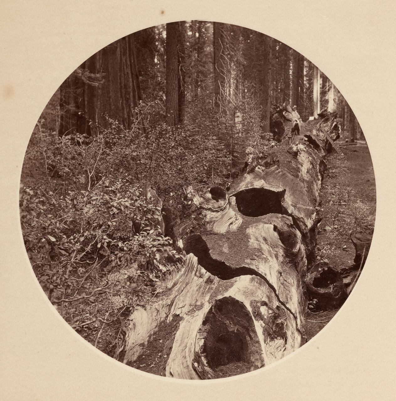 DescriptionUnmounted circular print. Image of large fallen log in forest.