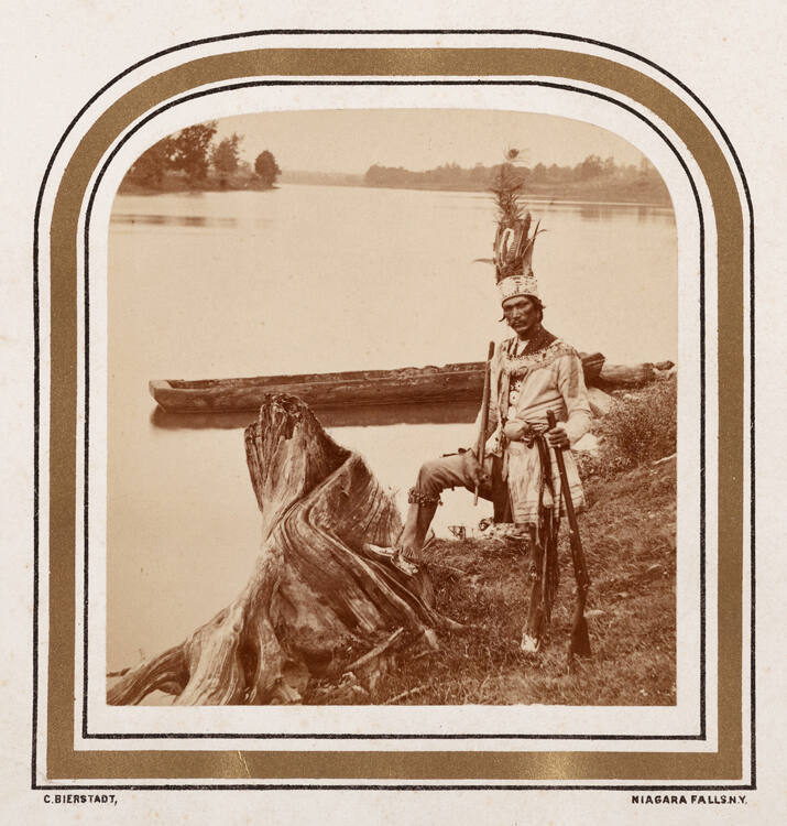 DescriptionImage of American Indian wearing headdress posed by shoreline with foot resting on tree stump and hand on shotgun.