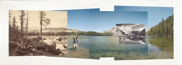 In this panorama, Mark Klett and Byron Wolfe combine contemporary color photographs of Lake Tenaya in Yosemite National Park with earlier images taken by Eadweard Muybridge, 1872 (far left), Ansel Adams, 1942 (middle), and Edward Weston, 1937 (right). By weaving these historic images into a panorama of their own, Klett and Wolfe explore the way individual artistic visions and different photographic processes can influence the depiction of a place as iconic as the American West.