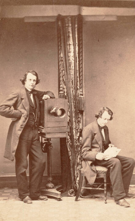 DescriptionCarte-de-Visite of a man standing with his arm resting on a large camera while the same man is shown seated nearby looking at an open book on his lap. He is wearing a suit with vest, tie, and long jacket.Gallery LabelCommercial studio photographers often advertised their talents using the carte-de-visite format. These pocket-sized pictures, mounted on cardstock, often functioned like business cards. Often, photographers used themselves as models, producing playful, inventive images to demonstrate their skills.