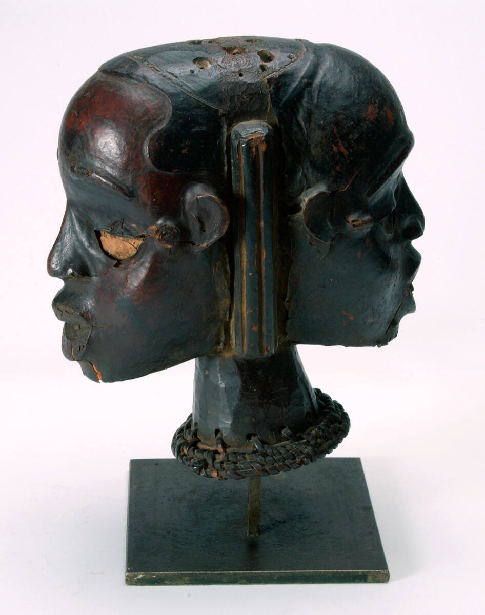 DescriptionJanus head cap mask carved from wood with basketry "cap" encircling the base of the sculpture. covered with hide exhibiting numerous cracks or splits in the hide surface.ProvenanceMelvin Dwork (1922-2016), New York, NY, by 1995;