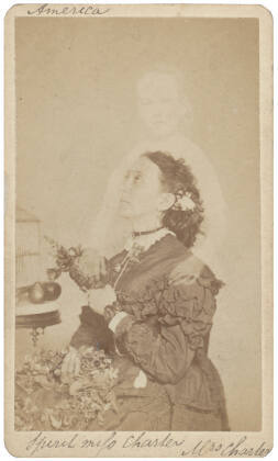 InscribedPhotographer's credit stamp on verso; label on verso: "No. 12 / Mrs. Charter, / E. Boston, / MASS. / SPIRIT CHILD. / This is a very excellent / picture, the lady being a me- / dium. The articles belong- / ing to the child were placed / on the table while the sitter / held in one hand a bouquet / of flowers, requesting men- / tally that the spirit would / rest its hand on it. As will / be seen, the request was / granted."Handwritten on verso: "Mrs. Charter [illeg.] a per / fect [illeg.] to the photo / graph - / Upon a [illeg.] nature / Dec. [illeg.] p. 515- / Were / M's process is to be found."