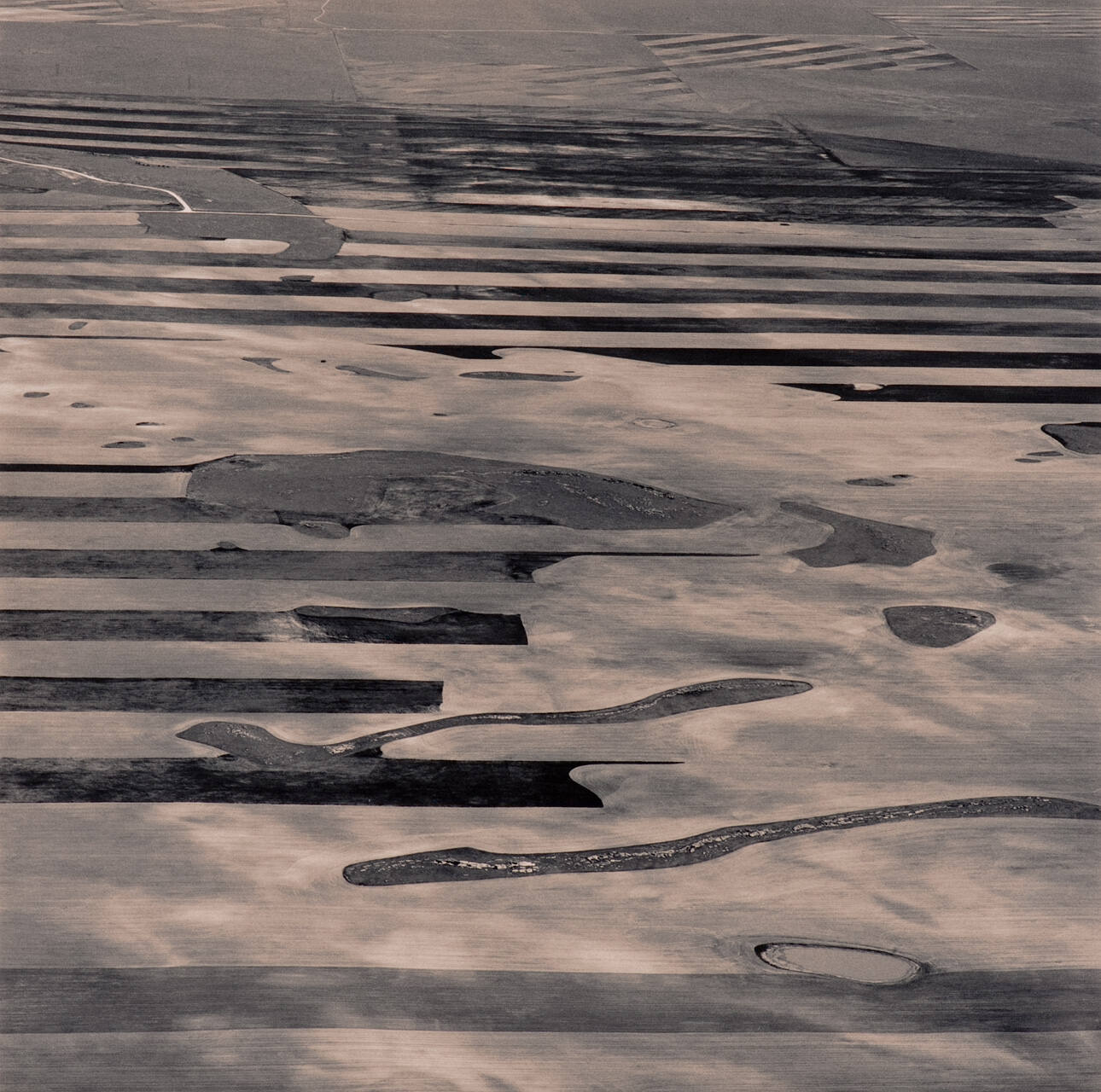 DescriptionAerial view of agricultural landscape composed of horizontal linear pattern.Copyright© Emmet Gowin