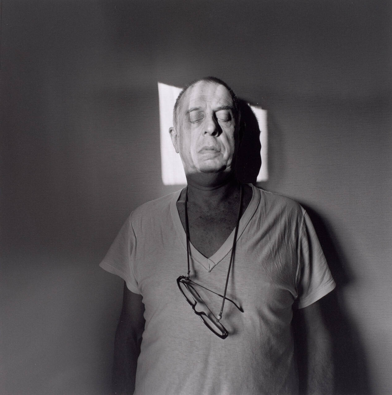 DescriptionImage of a man with eyes closed wearing a t-shirt and glasses around his neck standing against a wall. A small patch of light casts overs the figure's face.Exhibition HistoryRotation