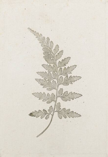 DescriptionEngraving of a fern leaf with its stem bending slightly to the left.Exhibition History