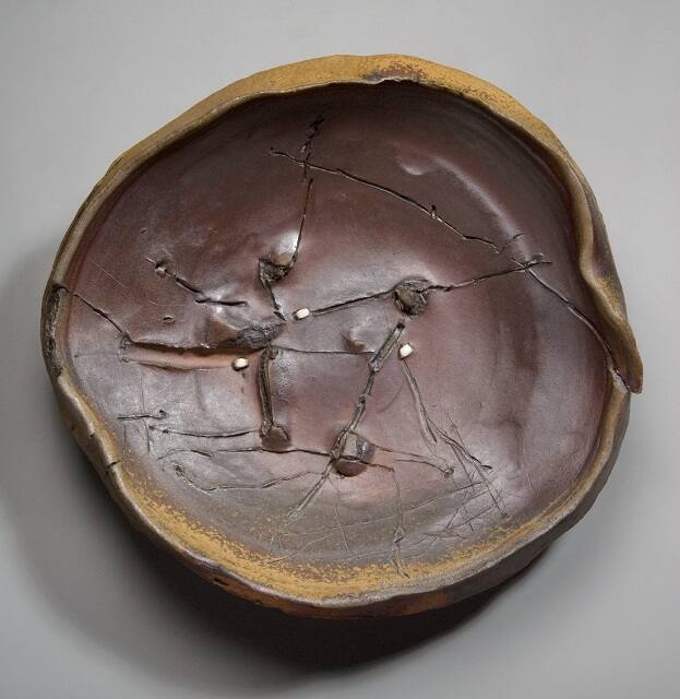 DescriptionAn irregular circular stoneware plate or charger of brownish glazed clay with tears, jabs and three small inclusions of kiln cones. Slight foot around the bottom and a thick rim around the edge.Gallery LabelPeter Voulkos, described as a rule-breaking innovator and an unorthodox teacher in the field of ceramics, eschewed consistency: "The minute you begin to feel you understand what you are doing you lose that searching quality…[Let] your emotions take over and what happens, happens." Inspired by the spontaneity of Japanese ceramics and American Abstract Expressionist painting, this work is charged with a sense of immediacy by Voulkos's gouges, tears and punctures, as well as the unpredictable forces of the wood kiln. The unglazed stoneware surface acquired a sheen from the flash of ash and fire, and swathes of black and blue resulted from stacking wood against the plates.