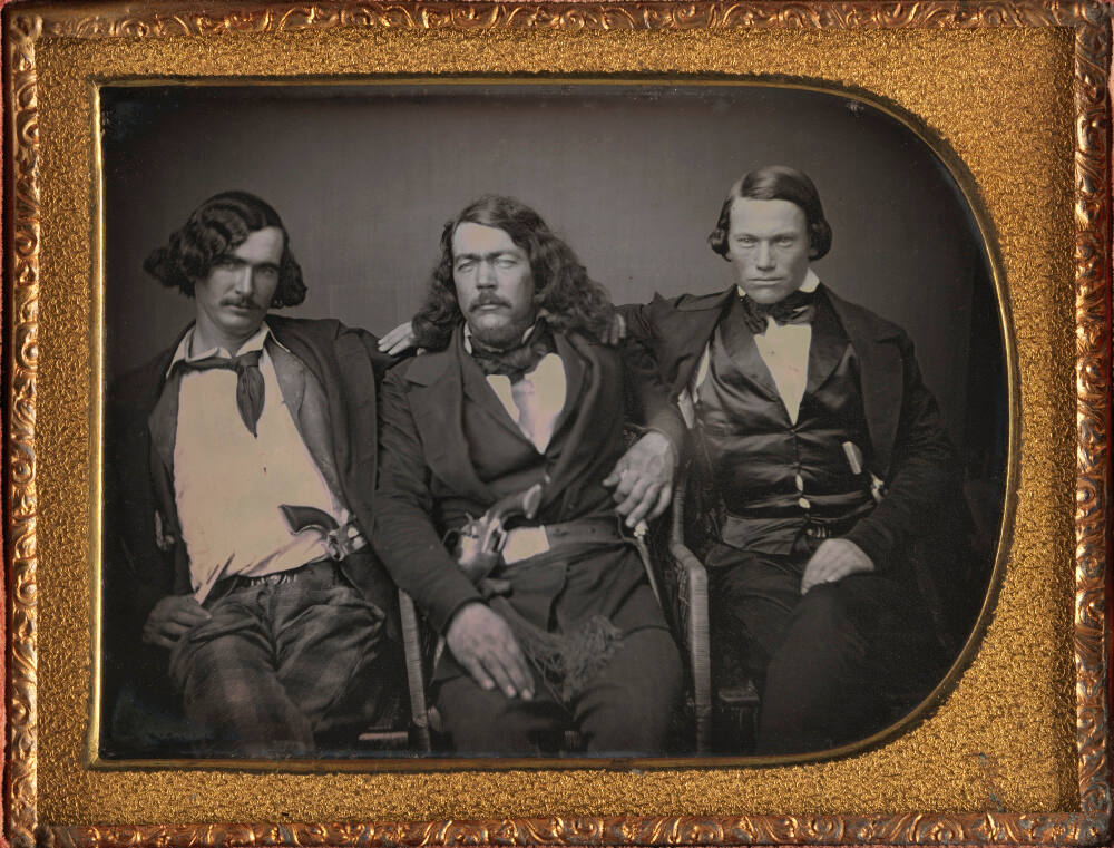 DescriptionImage of three seated men (possibly Lafayette Black with Captain Harry Love and William T. Henderson) with pistols and two with Bowie knife handles showing. From left to right, man on left has a 3rd Model Colt Dragoon pistol holstered on his left side, his right hand is resting on a knife so only what appears to be an ivory handle is showing. He also is wearing an interesting belt buckle. The man in the center (Captain Harry Love) has a 2nd Model Colt Dragoon in his right side belt, his left hand is resting on a knife handle. A rectangular belt buckle at the center and fringe from a sash are at his right hand fingertips. The man on the right (William T. Henderson) has the backstrap and grips of a pistol on his left coat flap visible. This quarter plate daguerreotype is housed in a brass mat inside of a brown leather-covered case with a floral motif and a red velvet liner.Published ReferencesWilliam B. Secrest, The Man From the Rio Grande: A Biography of Harry Love, Leader of the California Rangers Who Tracked Down Joaquin Murrieta (Spokane: Arthur H. Clark Co., 2005).