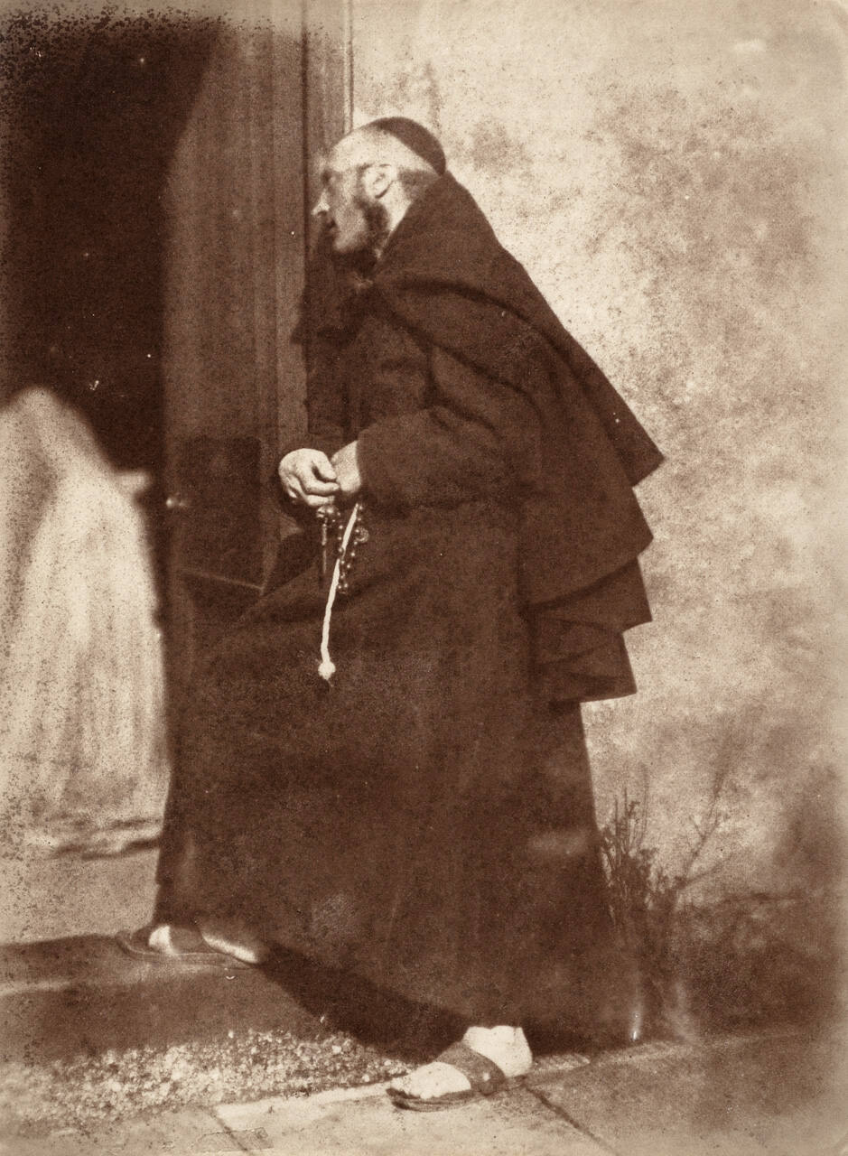 DescriptionImage of a man standing in front of an open door with one foot on the threshold; he wears a dark floor length garment and holds a strand of beads.Gallery LabelDavid Octavius Hill and Robert Adamson first collaborated making photographs that were used to assist Hill’s practice as a painter. A partnership quickly developed, with Hill composing the scenes and posing sitters while Adamson operated the camera and printed the photographs with their signature soft warmth. This portrait, made in the pair’s first year together, features Hill’s friend, the Scottish painter William Leighton Leitch (1804–1883), dressed as a monk preparing to visit the dying.