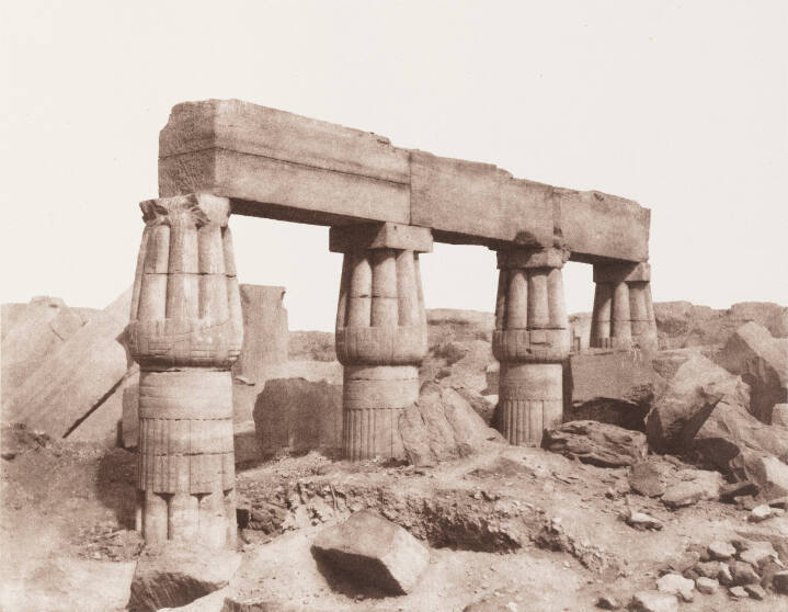 DescriptionImage of a portion of a colonnade with four columns and three lintels. The colonnade stands among large rocks in uneven terrain.Exhibition HistoryExploring Egypt: 19th Century