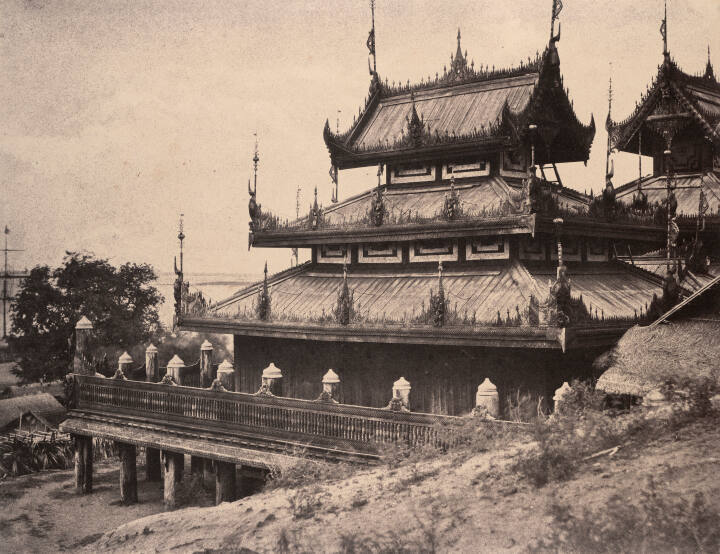 DescriptionImage of a building with four levels - each with a curved, elaborate roofline. A hillside cuts diagonally across the right side of the photograph.Gallery LabelThis photograph depicts a Buddhist monastery in Burma (now Myanmar). Captain Linnaeus Tripe served as official photographer to the British Colonial Government in India in the 1850s. He documented the diplomatic mission to Burma in 1855, two years after a war that had ended with the country ceding land to British India. Tripe used a large-format camera to make landscape and architectural views like this. His photographs were remarkably consistent, considering the challenges that the region’s heat fluctuations and humidity posed to his materials.