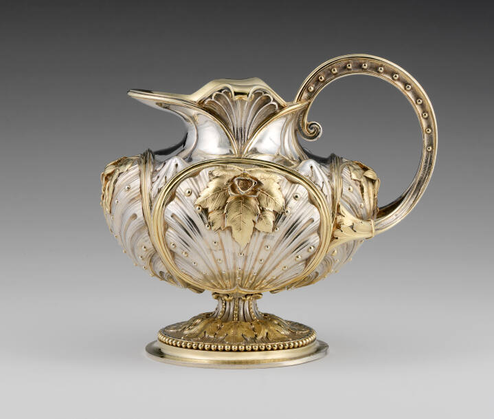 DescriptionThe service is comprised of a lidded teapot, lidded coffeepot, cream jug and sugar bowl with lid. The pedestal bases of all four pieces are similar in style: three-petaled gilt leaves radiate from the center and the edge is encircled with a beaded gilt border. The teapot and sugar bowl have an onion-dome shaped bulb between their base and body. Each piece is of ovoid form cupped on four sides with a fluted and gilt-beaded shell. With the exception of the coffeepot, each shell is encircled with gilded and ribbed banding; the banding extends on the teapot to form a double looped handle. The shells are crowned with a cluster of gilded leaves, similar to type of leaves on the base, which radiate from a gilded flower head. The lids of the teapot and sugar bowls are formed by four inversed shells. The triangular areas formed between the shells are ornamented with flowers and foliage. The finials of the teapot and sugar bowl lids are in the form of a flower bud with gilded beading. The handles of the cream jug and the coffeepot are ornamented with gilded beading on the sides; the coffee pot handle also has gilded diagonal and crisscrossed gilded lacing and is inlaid with ivory. The coffeepot spout is decorated with tri-lobed triangular motifs enclosed in a lattice of gilded ribs that intersect on the sides with a vertical gilded rib and bead. The neck of the coffeepot is ornamented with scalework and gilded beading; the lid is helmet shaped and decorated with gilded scrolls and beading.Gallery Label