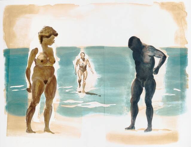 DescriptionNude woman, left, standing on shore, right arm dangling, looking right toward dark blue man, facing left, head downward, proper left arm bent, hand at waist. In water, center, frontal view of emerging nude man, arms swinging.Copyright© Eric Fischl / Artists Rights Society (ARS), New York