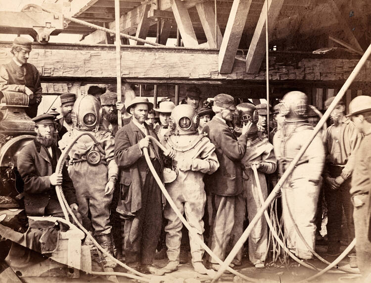 DescriptionImage of a group of men, including some in diving suits, standing closely together with tubes and ropes stretched across them.Gallery LabelConstruction of the Kansas City Bridge began in January 1867 and was finished in July 1869. To withstand the current of the Missouri River, seven piers were constructed beneath the bridge. This photograph documents the four divers sent to build the underwater foundations for the piers—a very hazardous job. This project was supervised by chief engineer Octave Chanute.