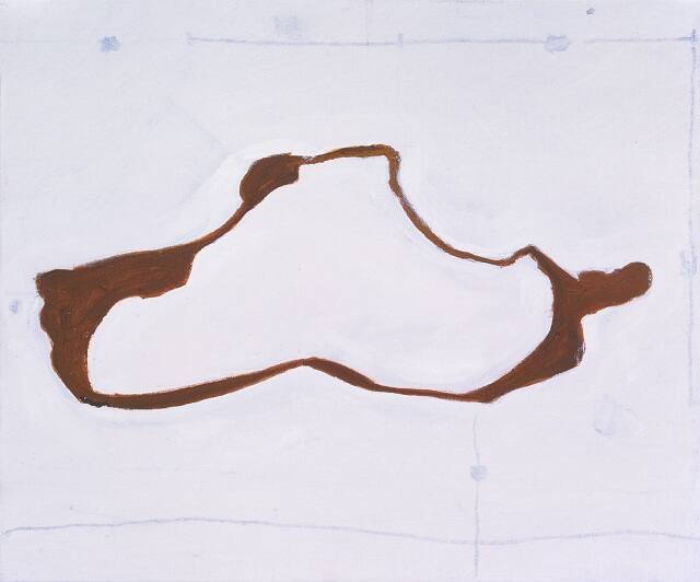 The red organic shape may have been inspired by ordinary forms-a coffee stain or a pattern of asphalt on a street. As it relates to the gunshot allusion, it may suggest the outline of a pool of blood. Whatever the references, the real subject of Untitled is its formal qualities of painting: line, shape, color and proportion.