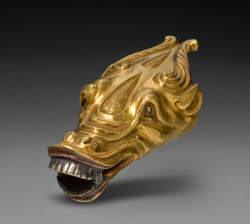 DescriptionThe small dragon head is cast in gold, the eyes are painted in black, and its teeth are encrusted in silver. The dragon's open mouth reveals its protuberant silver teeth. The dragon's head is relatively flat and hollow inside. Curvy, additive waves are crisply sculpted on top of the nose and horns. Herringbone-shaped patterns are densely engraved along the edge of the mouth, under the chin, between the eyes, inside the ears, and the rear of the head. The rear of the head is cast with upper and lower narrow extensions that originally held another supporting object.