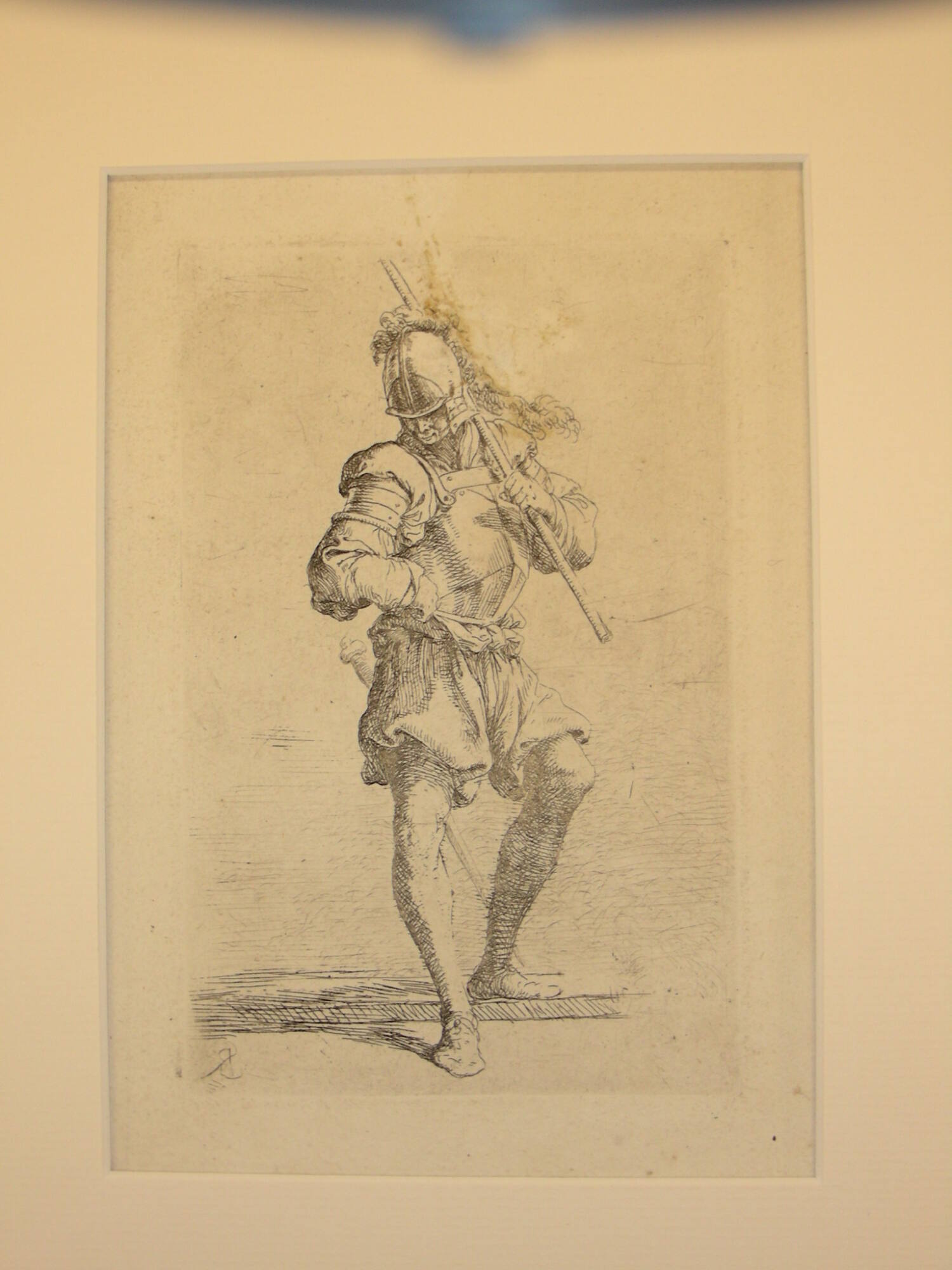 DescriptionSoldier in part armor, plumed helmet, head looking left and downward, stepping off ledge with right foot. Staff in left hand held over shoulder. Right hand thrust beneath breast plate. Sword behind legs, slanting right from waist to left ankle.