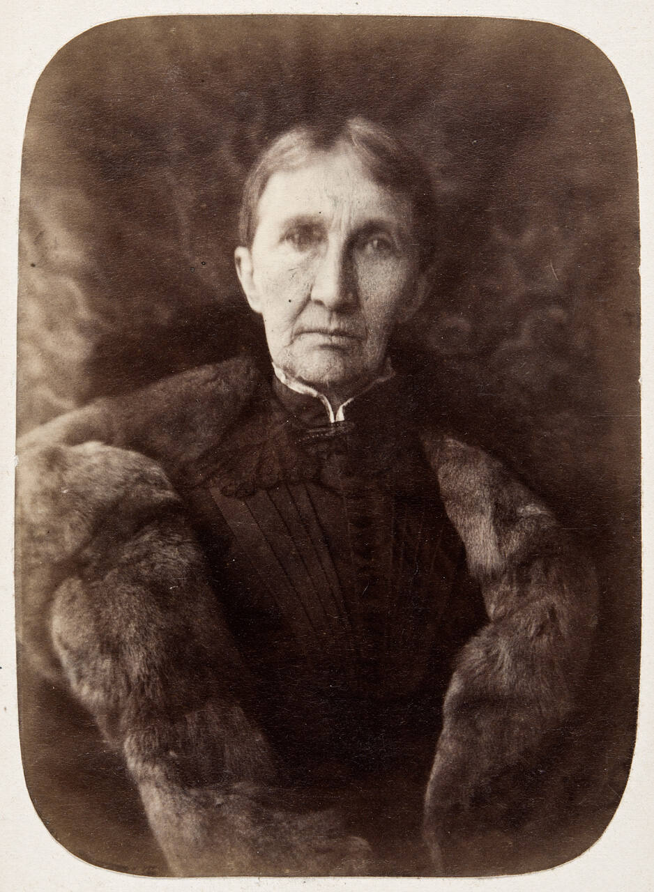Portrait of an older woman from the waist up, wearing a black dress and fur shawl.