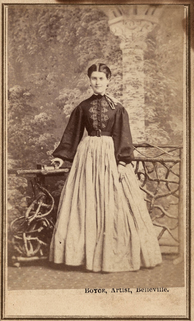 DescriptionFull length portrait of a young woman in a light colored skirt and a dark blouse with full sleeves standing in front of a backdrop painted with trees. Rests her hand on a book sitting on a small table made of branches.