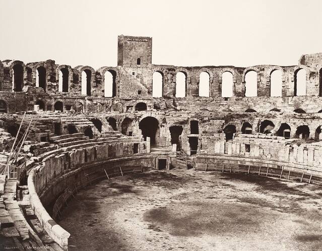 DescriptionImage of the ruins of an outdoor amphitheatre with archways and seats situated around a circular center courtyard.
