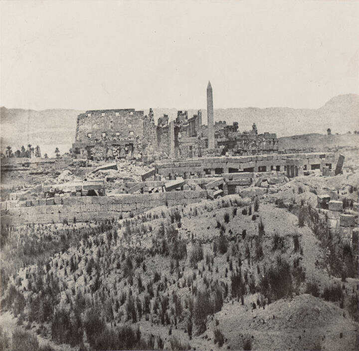 InscribedPrinted on top mount: "Thébes." Printed bottom right on mount: "Gide et Baudry, Editeurs;" cneter: "Palais de Karnak. / Vue Générale de Ruines, Prise a L'Est / Imprimerie Photographique de Blanquard-Evrard, à Lille / Pl. 31."