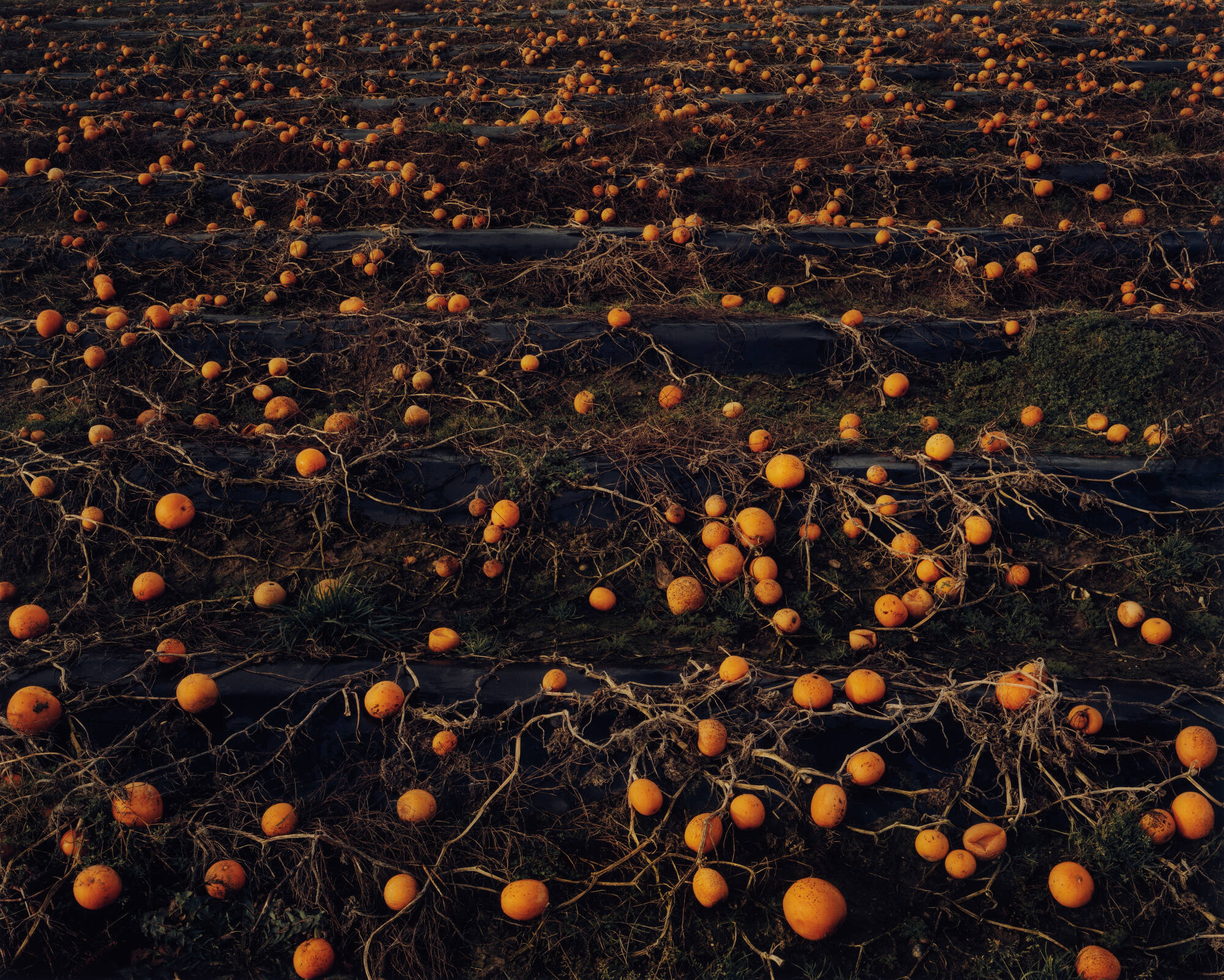 DescriptionColor landscape depicts a furrowed field covered with a new crop of orange pumpkins (or gourds). No visible horizon line.Exhibition HistoryThe Course of History. Foley Gallery, New York, NY, 2005.