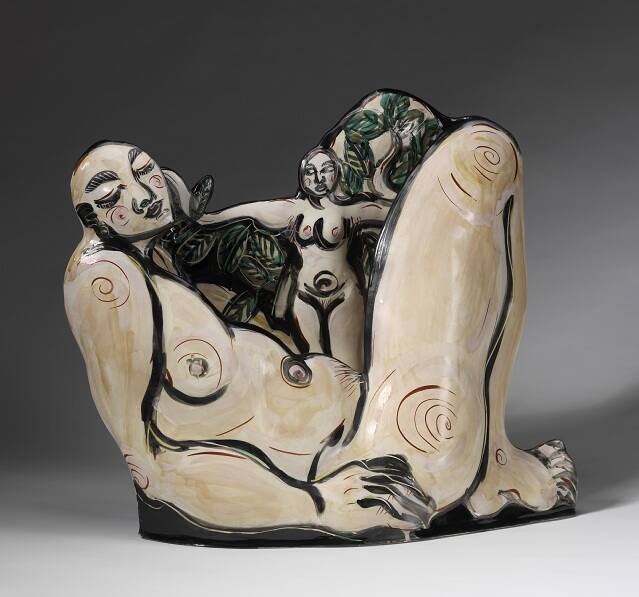DescriptionThe front face of the ceramic vessel is in the form of a reclining female figure with legs bent and feet on the ground. The female figure's body is glazed in tones of white, red, yellow, and peach with heavy black lines outlinging the body and creating the facial features. On the interior back wall, a small female figure appears to stand on the abdomen of the reclining female figure and is similar in appearance to her. To either side of the small figure's arms are dark and light green leaves, outlined in black. A reclining male figure is depicted on the exterior of the back side of the piece with a small female figure, surrounded by dark and light green leaves, perching on the male's proper right thigh.Copyright© Estate of Akio Takamori