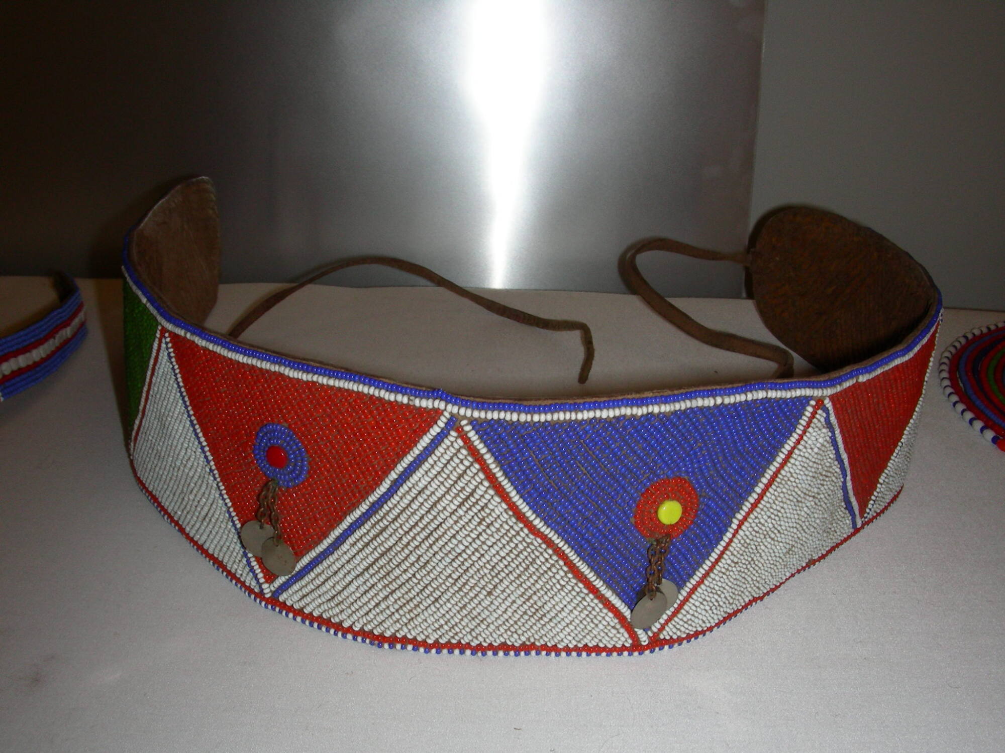 DescriptionThis wide beaded hip belt is secured with two leather thongs threaded through a beaded opening on each end. The surface design consists of seven large beaded triangles of red, green, and blue along one belt edge interlocked with seven opposing white triangles. The two central triangles, of blue and red, are embellished with a short doubled bead strand with a small metal disk attached to each end. This geometric design's pairing of red and blue or red and green, separated by white, displays the Maasai aesthetic of juxtaposing complementary oppositional colors.ProvenanceAcquired in Kenya by Linda M. Livingstone’s father, 1950s [1];