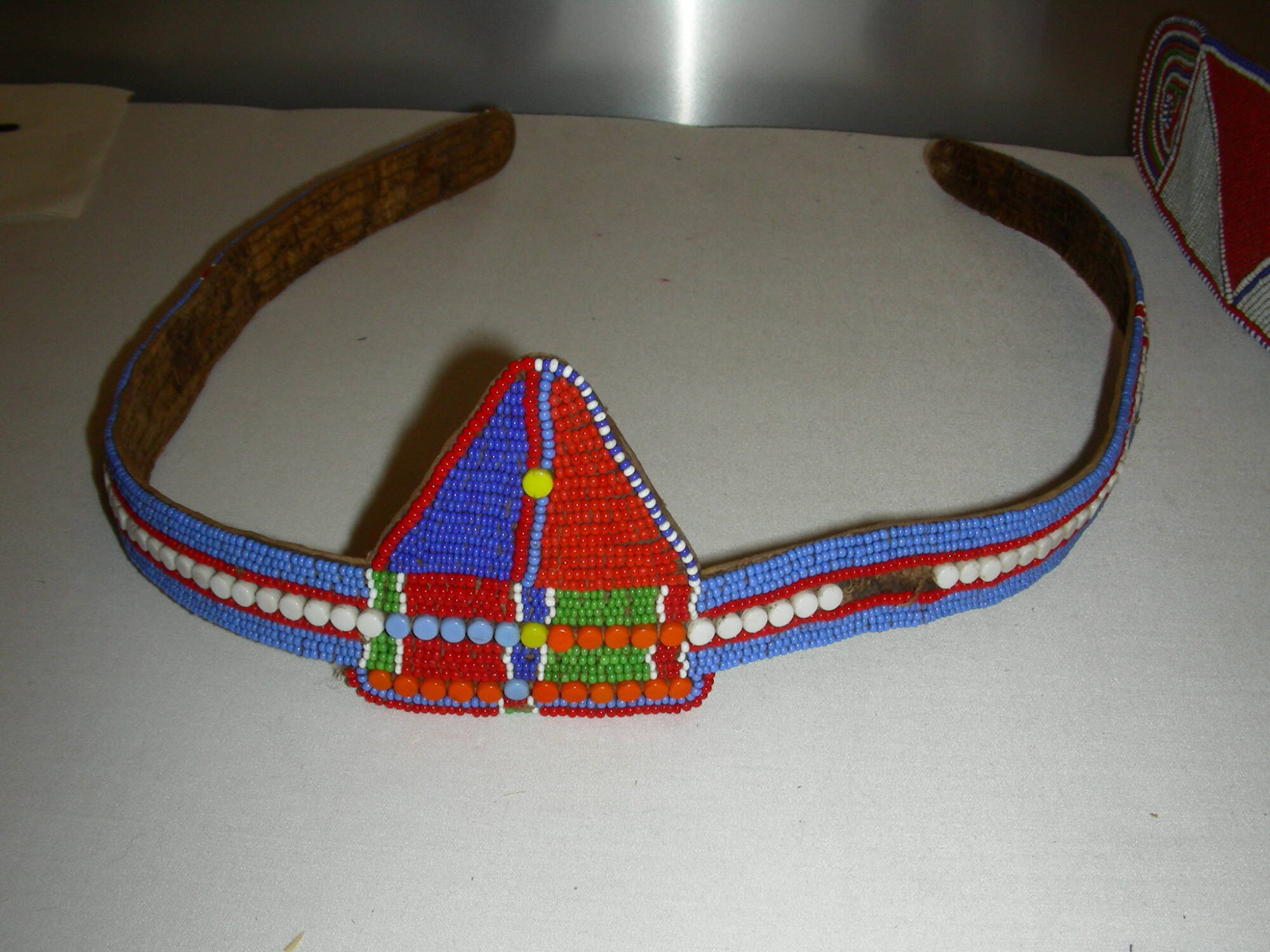 DescriptionNarrow beaded belt with central triangular shield (worn with projection facing upward). Two beaded lines divide the triangular shield in half, creating a smaller blue triangle on the left and a red triangle on the right. This division extends downward, with beaded lines dividing the shield's rectangular base into two smaller squares of red (left) and green beadwork. The length of the belt is covered in light blue beads with a central row of larger flat white beads framed by two beaded red lines. The belt tips are beaded in red (left) and green, and 2 bands of white and red beads crossing the width of the left and right sides of the belt.ProvenanceAcquired in Kenya by Linda M. Livingstone’s father, 1950s [1];