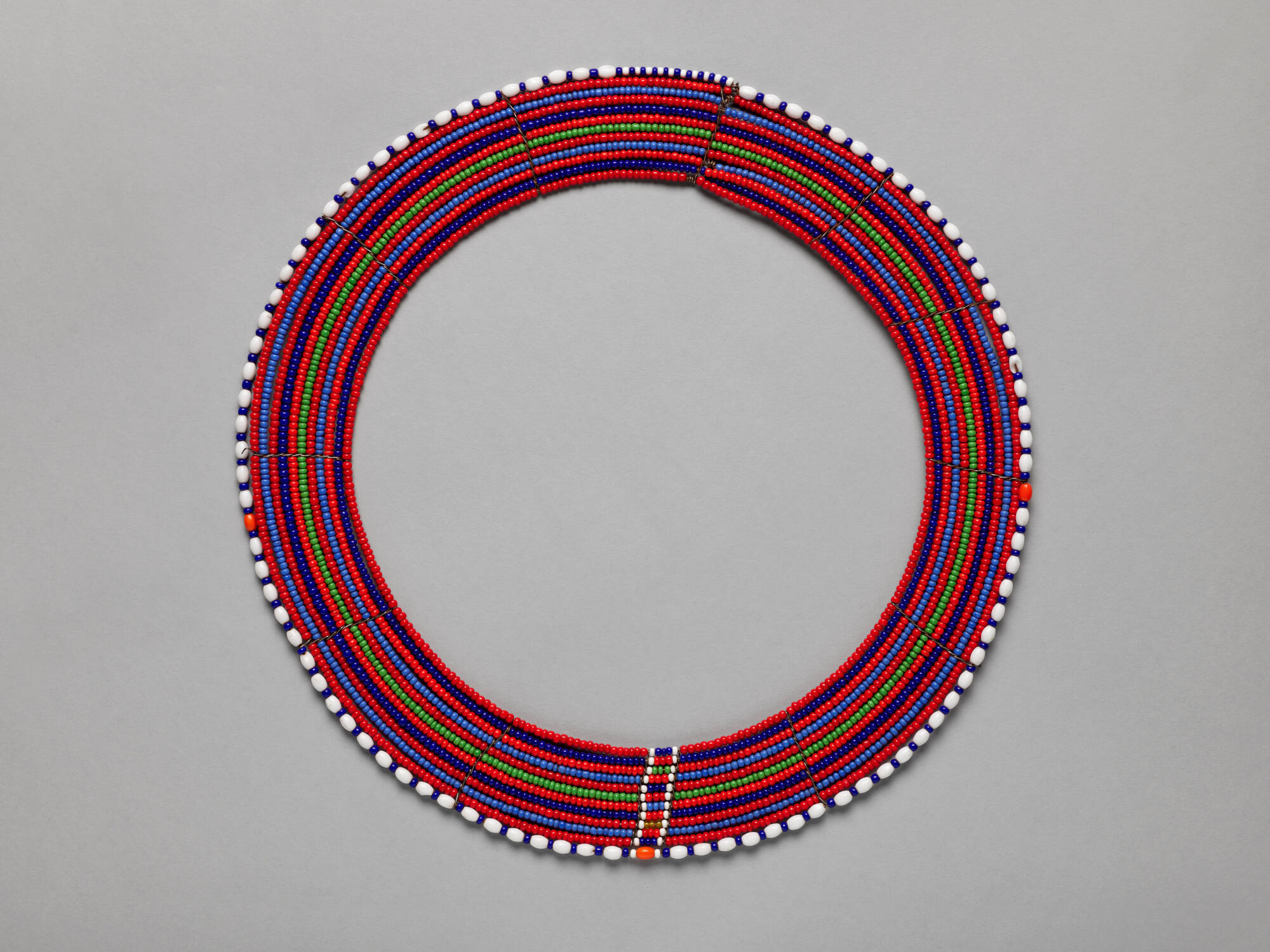 DescriptionThe next to largest of four matching necklaces in the form of flat beaded collars with a simple back opening. Concentric rings of red glass beads strung on wire, with four bead strands in the Maasai complementary oppositional colors of light blue, green, and deep blue. The concentric rings are joined together with wire at six points, with the center front of the necklace joined by a band of white, red, and blue beaded lines. The necklace's outer ring is composed of large white beads interspersed with smaller blue beads, with a large red bead positioned at the center and mid-points of the necklace sides.ProvenanceAcquired in Kenya by Linda M. Livingstone’s father, 1950s [1];