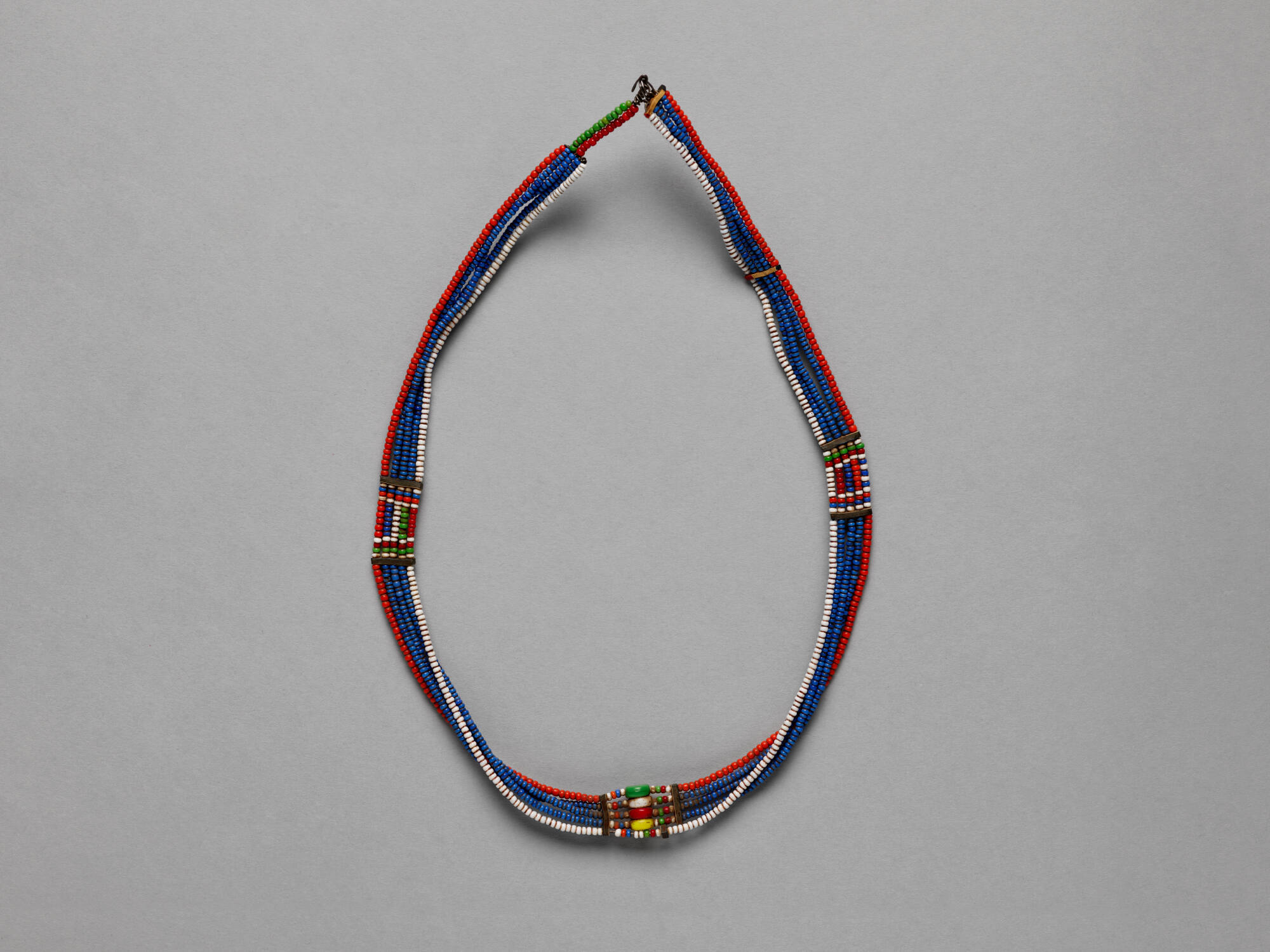 DescriptionNecklace composed of multiple strands of colored beads in red, light blue, and white. Thee strands are joined by bands of beads at the front and centerpoint of the necklace sides. The front band is embellished with a row of four large beads, of green, white, red, and yellow.ProvenanceAcquired in Kenya by Linda M. Livingstone’s father, 1950s [1];