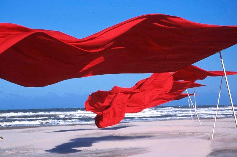 DescriptionThis video depicts swaths of red fabric 15 meters long, which are hung to blow in the wind, or are laid along the seashore to form a ribbon on brilliant color.Gallery Label