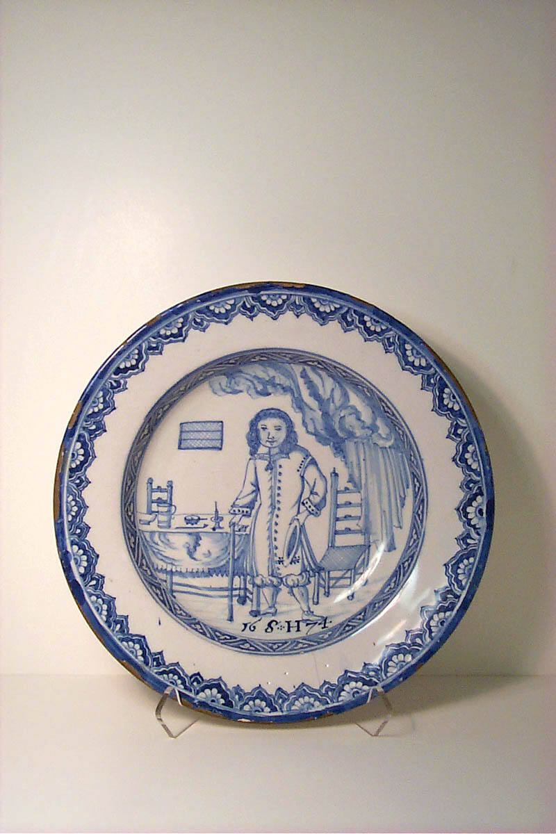 DescriptionPainted in blue on white ground. Center, full-length figure of a man with stick and hat; behind him, chair a a table bearing tankard, pipe, tobacco box, and candlestick. Rim border of Ju-u-i-shaped lappets, trellis well border, curtained background.