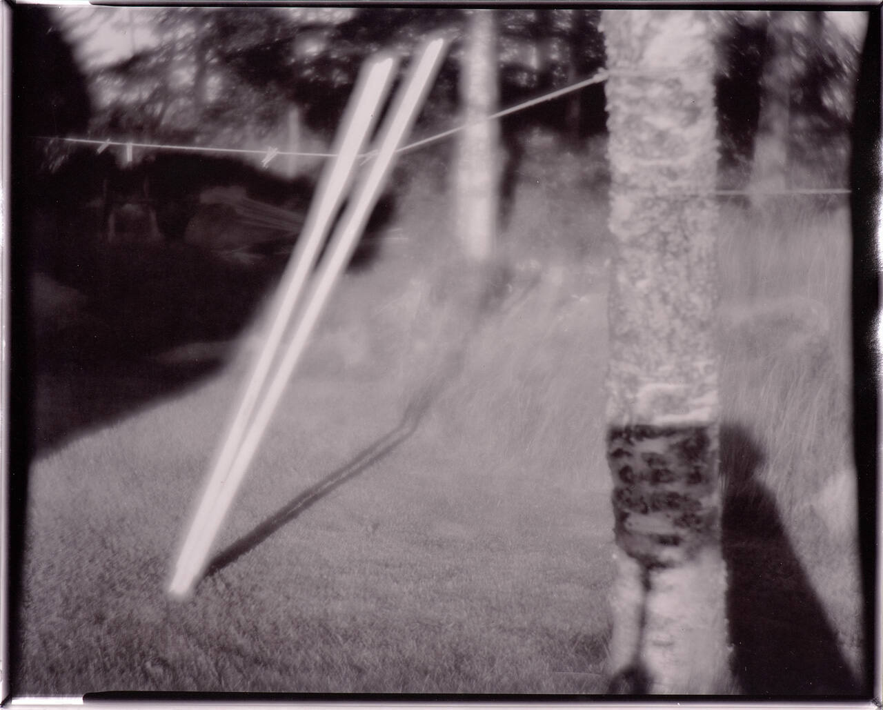 untitled (two poles of light leaning against clothes line, tree foreground right)