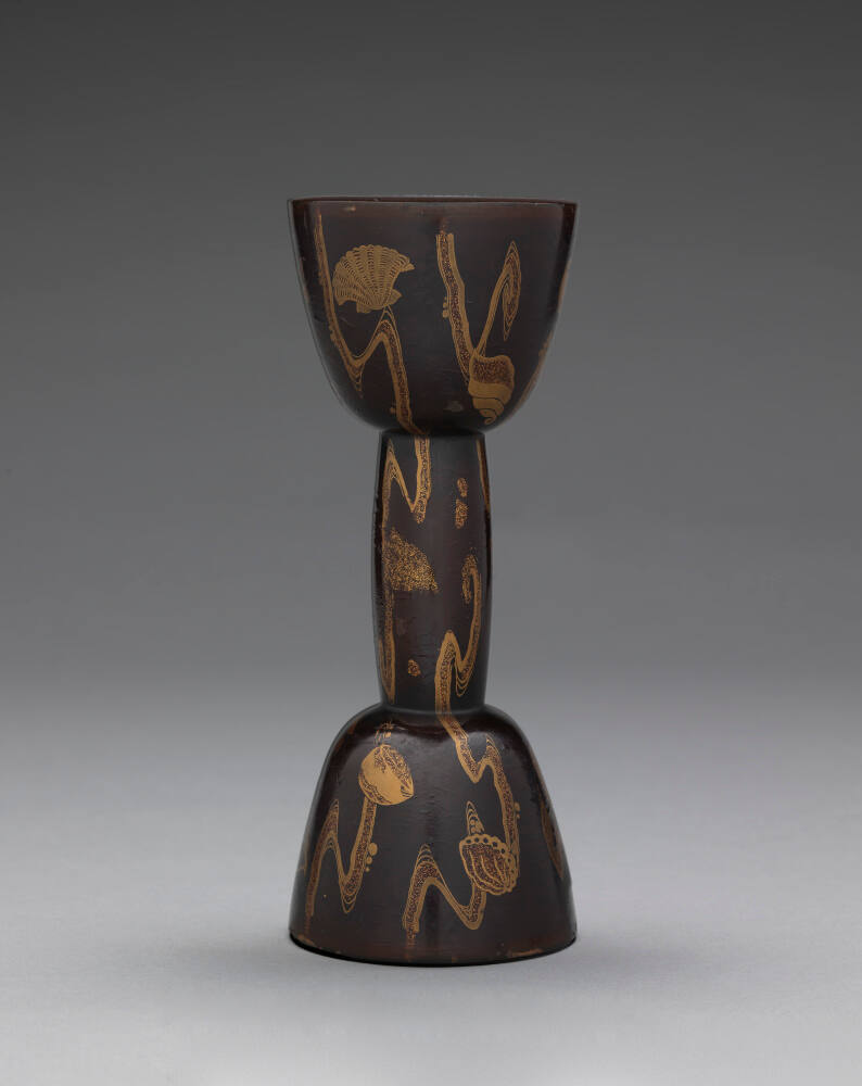 DescriptionThe drum core is made of a single block of hollowed wood in the shape of an hourglass. Inside, the wood is channeled. The lacquer coat of the exterior is decorated with flowing streams and a variety of seashells in gold. Some forms of the gold decorations are of solid, flat shapes, while others are textured by gold burrs sprinkling over the brown lacquer.Gallery LabelThe sound of a beating drum can evoke strong emotions when matched with performers on stage. The musician playing this drum would join flutists, chorus members, and actors on stage during a traditional form of Japanese theater called Nō. The shell of the drum, called kotsuzumi (the double-headed hourglass-shaped shoulder drum), is often lacquered.