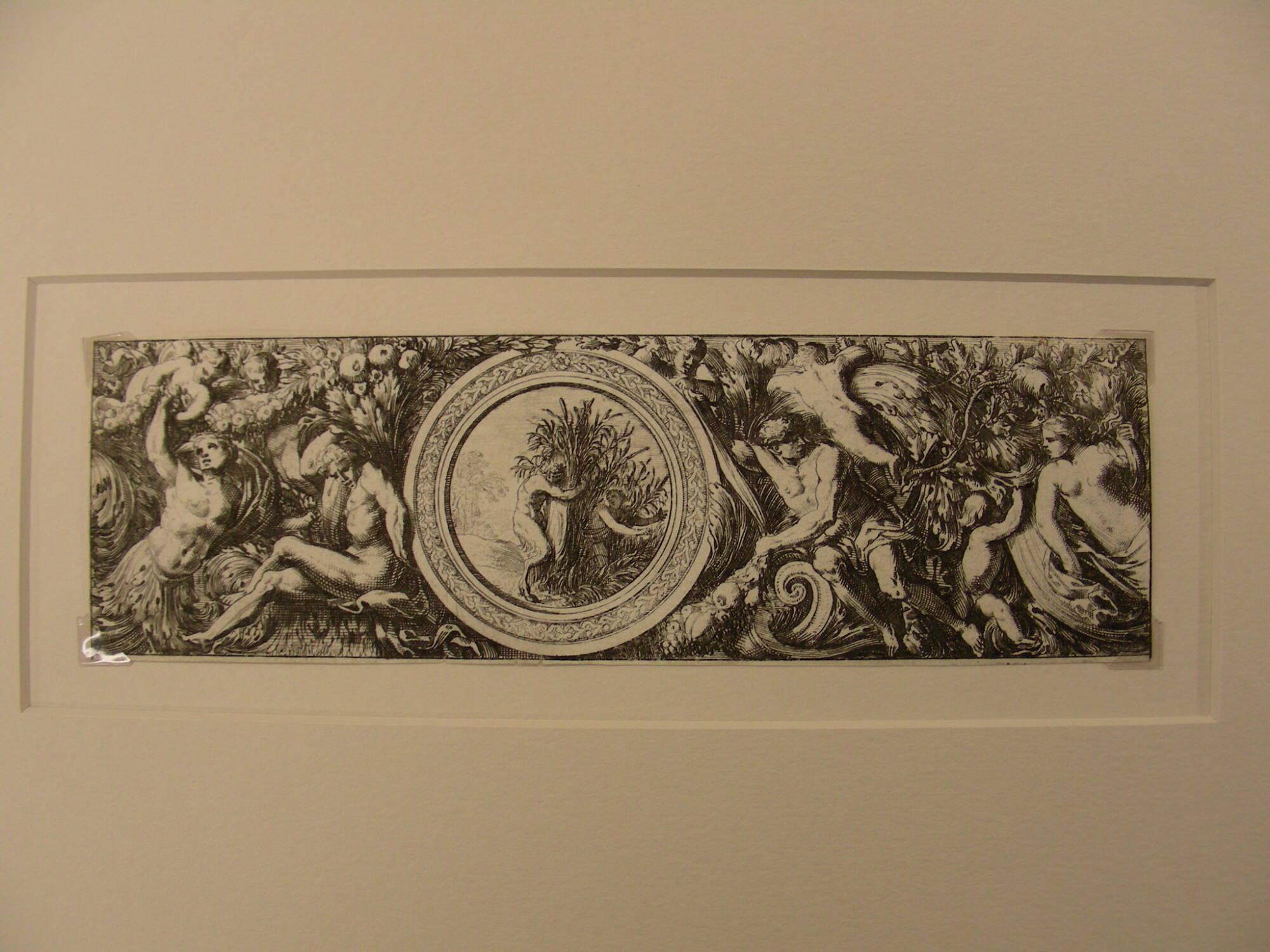 DescriptionA black and white print of an architectural nature. In the center of the horizonal piece is a circle with two figures. The one on the left has his arms around some tall grasses. The one on the right is hiding in these grasses. There are figures on each side of the circle that blend into the overall pattern.