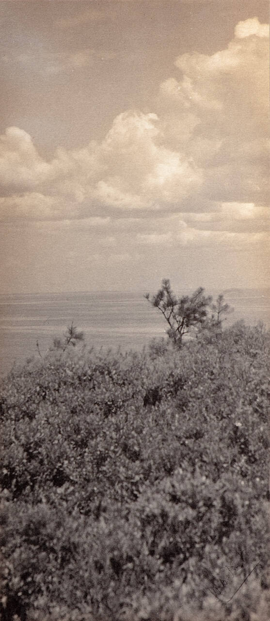 DescriptionView of cloud-filled sky, with scrub vegetation in foreground; sea (?) in background at bottom