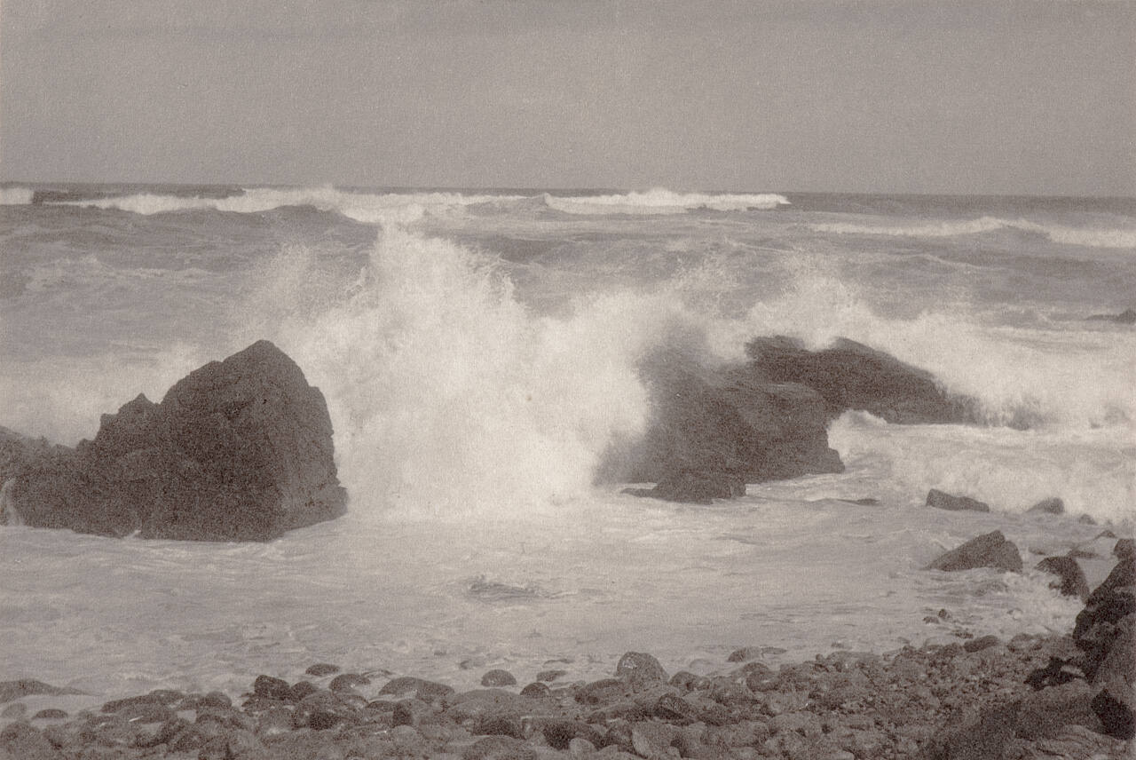 DescriptionView of a rocky shoreline and seascape; waves crashing on the rocks