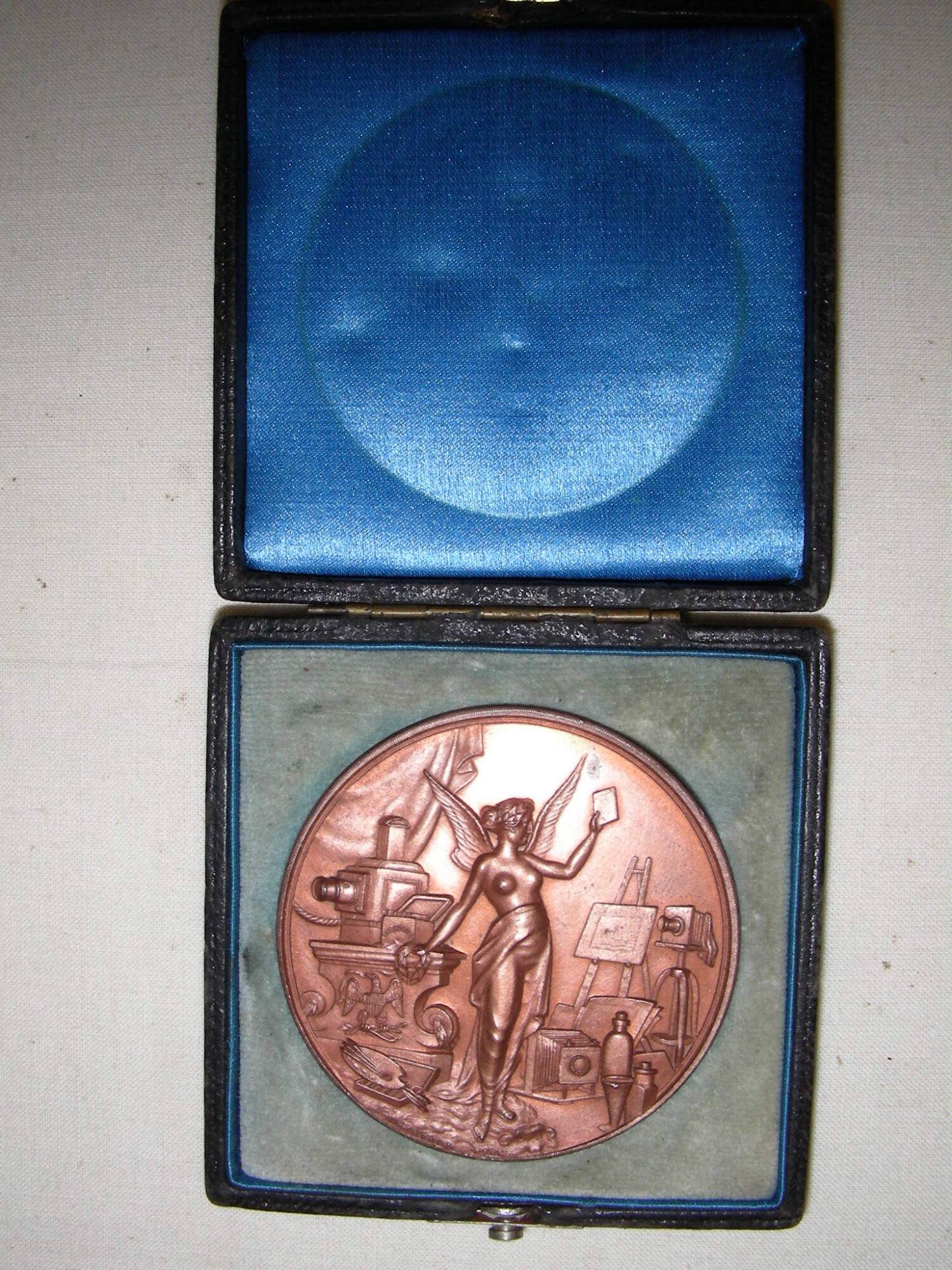 DescriptionRecto: Carved in low relief, an allegorical female figure surrounded by various kinds of cameras.Verso: Engraved text: "The Photographic Times Awarded to W. B. Post"